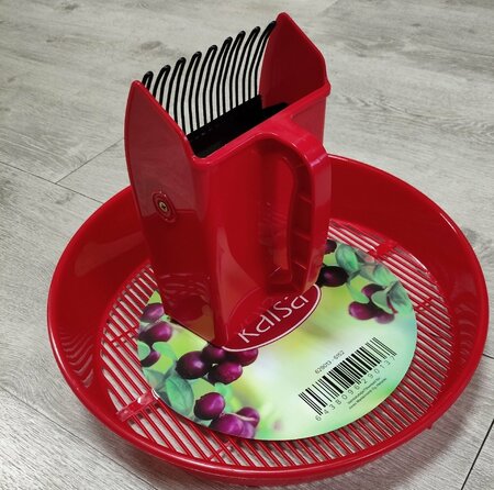 Комплект из двух предметов включает в себя сито диаметра 36 см финской торговой марки Kaisa и плодосборника с металлическими зубчиками (плодосборник без бренда). Сито изготовлено из высококачественного пластика и с лёгкостью очищает любые ягоды от лишнего "лесного мусора" (листики, веточки, иголки). Сито имеет «высокие "борта" – максимальная высота 7,5 см, минимальная 4,5 см. Вес 180 г. Классический пластиковый плодосборник с металлическими зубчиками. Конструктивно состоит из корпуса или накопителя для ягод, металлического отсекателя, препятствующего высыпанию собранных ягод наружу и пластиковых зубчиков. Расстояние между зубчиками рассчитано таким образом, чтобы в емкость попадало минимум листьев и при этом растение получало минимум повреждений. Материал: ударопрочный пластик, пищевой полипропилен. Размер плодосборника (длина х ширина х высота с учётом ручки) 230 х 140 х 125 мм. Вес плодосборника: 340 г.