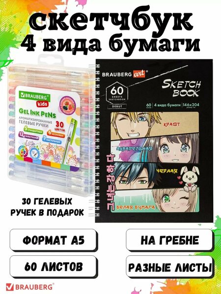 Скетчбук BRAUBERG, формат A5, 60 листов, 4 вида бумаги, 30 гелевых ручек в подарок