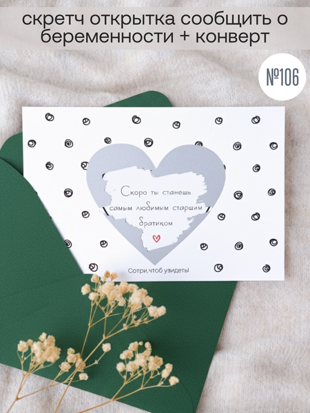 {"widgets":{"@card/UniversalPromoBadge":{"/content/page/fancyPage/defaultPage/universalPromoBadge":{"wrapperProps":{"margins":{"bottom":"3"}},"initialTime":1771331286648,"offerComposeId":"10910477565230266997"}}},"meta":{"/content/page/fancyPage/defaultPage/universalPromoBadge":{"name":"@card/UniversalPromoBadge"}},"collections":{"productServiceSnippets":{"10910477565230266997":{"productSnippet":{"snippetId":"document_id","type":"MODEL_CARD_LAYOUT","productPayload":{"snippetStyle":"NORMAL","title":{"value":"Скретч открытка о беременности \"Ты станешь старшим братом\" с конвертом"},"badges":{},"price":{"actualPrice":{"amount":{"intPart":65576,"currency":"UZS"},"style":"RED","type":"OTHER_DISCOUNT"},"oldPrice":{"amount":{"intPart":80222,"currency":"UZS"},"style":"STRIKETHROWED"}},"signals":{"customsFee":{"text":{"text":"Возможна пошлина"}}},"gallery":{"mediaItems":[{"picture":{"baseUrl":"https://avatars.mds.yandex.net/get-mpic/16296510/2a0000019a545df751f39fc2142dbf74c423/","width":1500,"height":2000,"title":"Скретч открытка о беременности \"Ты станешь старшим братом\" с конвертом"},"type":"IMAGE"},{"picture":{"baseUrl":"https://avatars.mds.yandex.net/get-mpic/15382907/2a00000198ce7f8d67083fe4958f0d96a121/","width":1500,"height":2000,"title":"Скретч открытка о беременности \"Ты станешь старшим братом\" с конвертом"},"type":"IMAGE"},{"picture":{"baseUrl":"https://avatars.mds.yandex.net/get-mpic/16922484/2a00000198602fa212eb2c4315f0a5451a5d/","width":1500,"height":2000,"title":"Скретч открытка о беременности \"Ты станешь старшим братом\" с конвертом"},"type":"IMAGE"},{"picture":{"baseUrl":"https://avatars.mds.yandex.net/get-mpic/18412261/2a0000019a545df74ffa71a367369674adae/","width":1500,"height":2000,"title":"Скретч открытка о беременности \"Ты станешь старшим братом\" с конвертом"},"type":"IMAGE"},{"picture":{"baseUrl":"https://avatars.mds.yandex.net/get-mpic/15034155/2a00000198602fa21fd47a347de8cf4aeab4/","width":1500,"height":2000,"title":"Скретч открытка о беременности \"Ты станешь старшим братом\" с конвертом"},"type":"IMAGE"},{"picture":{"baseUrl":"https://avatars.mds.yandex.net/get-mpic/16786454/2a0000019a545df7530a66fc48f117247fe7/","width":1500,"height":2000,"title":"Скретч открытка о беременности \"Ты станешь старшим братом\" с конвертом"},"type":"IMAGE"},{"picture":{"baseUrl":"https://avatars.mds.yandex.net/get-mpic/5426148/2a00000192b94090ffda52797eee6f698e39/","width":1500,"height":2000,"title":"Скретч открытка о беременности \"Ты станешь старшим братом\" с конвертом"},"type":"IMAGE"}]},"rating":{"ratingValue":4.8,"ratingCount":94,"reviewsCount":22,"ratingCountStats":{"cnt1":1,"cnt2":2,"cnt3":1,"cnt4":4,"cnt5":86},"snippet":{"rating":"4.8","type":"product","description":"(94) · 822 купили","descriptionList":["(94)","822 купили"],"ratingStar":"5"}},"wishlistButton":{"businessId":3843547,"mskuId":101669965552,"modelId":1740129945,"oskuId":101669965552,"offerId":"nQoFETBKXVSOZP12sh80KA"},"productRating":{"rating":"4.8","type":"product","description":"(94) · 822 купили","descriptionList":["(94)","822 купили"],"ratingStar":"5"}},"baobabPayload":{"type":"offer","wareId":"nQoFETBKXVSOZP12sh80KA","modelId":1740129945,"marketSku":"101669965552","snippet_type":"product","isExpress":false,"price":80222,"additionalPrices":[{"priceType":"withDiscount","priceValue":65576},{"priceType":"unknown","priceValue":80222}],"hid":61461413,"shopId":431782,"shopSku":"ud000106","supplierId":3843546,"supplierType":3,"isUltima":false,"oskuId":101669965552,"snippetTheme":"GRID_FULL","stockCount":21,"rating":{"rating":"4.8","purchaseCount":"822","gradesCount":"94","ratingType":"product"},"promoLogJoinId":"9e2b70bfb82bf64b483e10508b9c8881/4a76affb8a328d98","shopPromoIds":["price_increase_promo_3843546"]},"themeType":"GRID_FULL"}}}}}