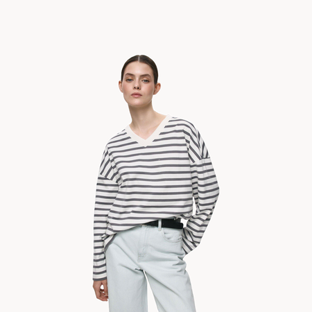 Этот базовый лонгслив в полоску подходит для фигуры любого типа, что делает его универсальным элементом гардероба. Он легко комбинируется с другими вещами, добавляя стиль и комфорт в ваш повседневный образ.