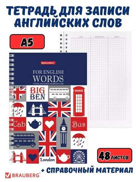 Тетрадь BRAUBERG, для записи слов английских слов, формат A5, 48 листов, клетка
