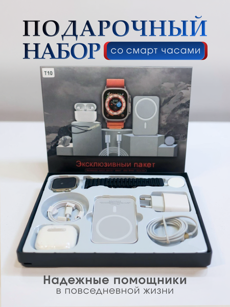 - 1. Умные часы с ремешком 2. Беспроводные наушники 3. Power bank (повербанк) на 5000 мАч 4. Беспроводная зарядка 5. Блок питания 6. Провод type-с/lighting 7. Инструкция на русском языке