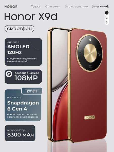 Смартфон HONOR X9d 5G — мощный, стильный и надёжный! ✨ Основные преимущества: Большой AMOLED-дисплей 6.79" с частотой 120 Гц — яркие цвета и плавная картинка. Процессор Snapdragon 6 Gen 4 — высокая скорость работы и энергоэффективность. Основная камера 108 Мп с OIS — детализированные фото и 4K-видео даже ночью. Фронтальная камера 16 Мп — чёткие селфи и видео в Full HD. Ёмкая батарея 8300 мА·ч — до 2 дней активной работы. Супербыстрая зарядка 66 Вт — 50% за считанные минуты. Память до 12 ГБ ОЗУ и 512 ГБ — достаточно места для всего. Поддержка 5G, Wi-Fi 6, GPS — всё, что нужно современному пользователю. MagicOS 9.0 на базе Android 15 — новая система с плавной анимацией и умными функциями. Защита IP66/IP68/IP69K — не боится воды, пыли и ударов. Дизайн: HONOR X9d сочетает изящный корпус толщиной всего 7,76 мм и лёгкий вес 193 г. Прочное алюмосиликатное стекло, приятные цвета — терракотовый, графитовый, золотистый, мятный. Звук и мультимедиа: Стереодинамики с технологией HONOR Sound 7.3 обеспечивают чистое и объёмное звучание. Поддержка форматов MP3, FLAC, OGG, AAC и других. Комплектация: Смартфон HONOR X9d Зарядное устройство HONOR SuperCharge (66 Вт) Кабель Type-C Защитный чехол TPU Защитная плёнка (установлена на экран) Инструмент для SIM-карты Руководство пользователя Гарантийный талон HONOR X9d 5G — флагманский уровень по доступной цене! Мощный процессор, огромная батарея, превосходный экран и стильный дизайн — всё, что нужно для комфортной работы и развлечений.