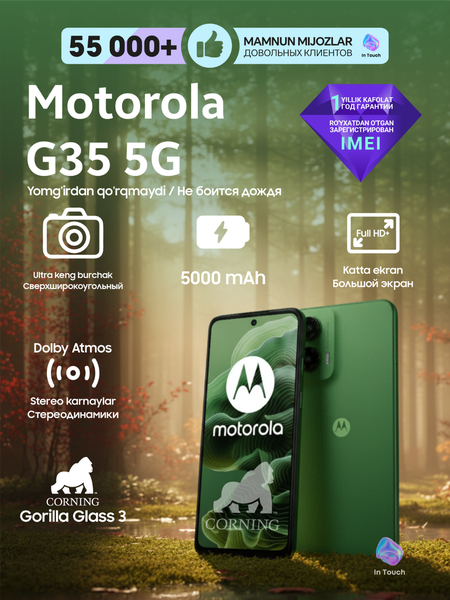 {"widgets":{"@card/DeliveryConsole":{"/content/page/fancyPage/defaultPage/deliveryConsole":{"configType":"MAIN_DO","shouldShowDeliveryPointAgitationBanner":true,"urlSlug":"smartfon-motorola-g35-5g-8256-gb-672-akkumulyator-5000-mach"}}},"meta":{"/content/page/fancyPage/defaultPage/deliveryConsole":{"name":"@card/DeliveryConsole"}},"collections":{"walterUtils":{"isWalterInitialSuccess":true,"isWalterWithoutFallback":true,"isWalterCanary":false},"deliveryConsole":{"8012615462842956386":{"title":"Доставка Маркета","signals":[],"options":[{"title":"Маркет","type":"MARKET","isChecked":true,"transitionId":"tr_195677684786448002","subtitle":{"date":{"value":"22 фев","features":["THINGRAY"]},"price":{"value":0,"valueFeatures":["THINGRAY"],"currency":"UZS","currencyFeatures":["THINGRAY"]}},"details":[{"title":"","deliveryOptions":[{"id":"2119928966931547916","address":{"addressLine":"Ташкент","addressLineObject":{"abbreviativePart":"Ташкент","isRegion":true,"isTagged":false}},"additionalInfo":"","signals":[{"title":{"content":[{"type":"literal","value":"15-30 мин. курьером в удобный момент"},{"type":"icon","value":"ai_chevron"},{"type":"newline","value":""}],"feature":"PRIMARY"},"analytics":{"type":"onClickSignal","text":"15-30 мин. курьером в удобный момент"},"popupInfoId":"pp_18064787403457921207"}]},{"id":"2119928966931547919","address":{"addressLine":"Ташкент","addressLineObject":{"abbreviativePart":"Ташкент","isRegion":true,"isTagged":false}},"additionalInfo":"","signals":[]}],"signals":[]}],"baobabModel":{"deliveryType":"ON_DEMAND","deliveryDays":3,"priceValue":0,"priceCurrency":"UZS","deliveryDateFrom":"2026-02-22","deliveryDateTo":"2026-02-22","deliveryText":"22 фев, по клику","precise":true,"selected":false,"calculatedFor":"1104c838b83f79c008df7d7a05c6846d;cYs6WOxf8hEoLKxZgaM1rQ"}}]}},"deliveryInfoOption":{"2119928966931547916":{"dayFrom":3,"dayTo":3,"deliveryType":"onDemand","date":{"value":"22 фев","features":["BOLD"]},"service":{"value":"по клику","features":["THINGRAY"]},"deliveryPrice":{"value":0,"currency":"UZS"},"price":{"value":0,"valueFeatures":["THINGRAY"],"currency":"UZS","currencyFeatures":["THINGRAY"]},"style":"BLUE","baobabModel":{"deliveryType":"ON_DEMAND","deliveryDays":3,"priceValue":0,"priceCurrency":"UZS","deliveryDateFrom":"2026-02-22","deliveryDateTo":"2026-02-22","deliveryText":"22 фев, по клику","precise":true,"selected":false,"calculatedFor":"1104c838b83f79c008df7d7a05c6846d;cYs6WOxf8hEoLKxZgaM1rQ"},"consoleDate":{"value":"22 фев","features":["THINGRAY"]}},"2119928966931547919":{"dayFrom":3,"dayTo":3,"deliveryType":"pickup","date":{"value":"22 фев","features":["BOLD"]},"service":{"value":"пункт выдачи","features":["THINGRAY"]},"deliveryPrice":{"value":0,"currency":"UZS"},"price":{"value":0,"valueFeatures":["THINGRAY"],"currency":"UZS","currencyFeatures":["THINGRAY"]},"style":"WHITE","baobabModel":{"deliveryType":"PICKUP","deliveryDays":3,"priceValue":0,"priceCurrency":"UZS","deliveryDateFrom":"2026-02-22","deliveryDateTo":"2026-02-22","deliveryText":"22 фев, пункт выдачи","precise":true,"selected":false,"calculatedFor":"4e2fe580b4414153180565c74f847b4b;cYs6WOxf8hEoLKxZgaM1rQ"},"consoleDate":{"value":"22 фев","features":["THINGRAY"]}}}}}