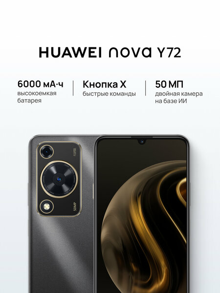 Погрузитесь в мир передовых технологий с HUAWEI nova Y72. Особенности • Размер экрана: 6,75” HD+ • Емкость батареи: 6000 мА*ч • оперативная память: 8 Гб; • встроенная память: 128 Гб; • Основная камера: 50 МП + 2 МП (макро) • Фронтальная камера: 8 МП • стандарт связи: 2G/3G/4G (LTE). Мгновенный Доступ: Окунитесь в любимые приложения сразу после нажатия кнопки X. Великолепные Моменты и Комфорт: Зафиксируйте великолепные моменты с камерой 50 МП и наслаждайтесь экраном с режимами защиты зрения. Долгое время автономной работы HUAWEI nova Y72 с высокоемкой батареей и мощной системой зарядки.