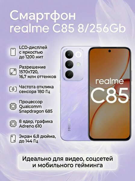 Смартфон realme C85 8/256Gb в стильном фиолетовом корпусе — это идеальный выбор для пользователей, ценящих производительность, ёмкий аккумулятор и качественный экран. Оснащённый мощным процессором Qualcomm Snapdragon 685 с 8 ядрами и графическим ускорителем Adreno 610 1.26 ГГц, realme C85 обеспечивает плавную работу приложений, комфортную многозадачность и быстрый отклик интерфейса. Большой 6,8-дюймовый LCD-экран с разрешением 1570×720 пикселей и соотношением сторон 90,4% впечатляет высокой яркостью до 1200 нит и поддержкой цветового охвата NTSC 83%. Частота обновления до 144 Гц и сенсор с дискретизацией 180 Гц (по умолчанию 120 Гц) делают прокрутку контента и игры невероятно плавными, а плотность пикселей 256 PPI обеспечивает чёткую и насыщенную картинку с глубиной цвета 16,7 миллионов оттенков. Основная камера 50 Мп с диафрагмой f/1.8, автофокусом и 5-линзовым объективом позволит создавать детализированные фотографии и видео в разнообразных режимах: портрет, ночная съёмка, панорама, кинематографический режим, таймлапс, подводная съёмка и PRO-режим. Фронтальная камера 8 Мп f/2.0 с широким углом 80° и поддержкой ночного режима идеально подходит для селфи и видеозвонков. Смартфон realme C85 оснащён сверхёмкой батареей 7000 мАч и поддержкой быстрой зарядки 45 Вт. Даже при активном использовании вы получите долгие часы работы без подзарядки. Устройство поддерживает Wi-Fi 5, Bluetooth 5.0, NFC, GPS/GLONASS/Beidou/Galileo, два слота Nano SIM и порт Type-C. Компактный и лёгкий, realme C85 весит всего 212 г и имеет толщину 8,38 мм. Интеллектуальная технология защиты аккумулятора обеспечивает долгий срок службы и стабильную работу даже при экстремальных температурах. Смартфон realme C85 8/256Gb — это сочетание мощности, стиля и надёжности для любых задач, от игр и фото до навигации и многозадачности. Этот фиолетовый realme C85 станет вашим надёжным помощником, позволяя оставаться на связи, создавать контент и наслаждаться технологиями без ограничений.