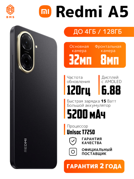 Redmi A5 — это смартфон с большим 6,88″ HD+ экраном и частотой обновления до 120 Гц. Он оснащён основной камерой 32 МП с поддержкой HDR и ночного режима, а также фронтальной камерой 8 МП для селфи и видеосвязи. Аккумулятор ёмкостью 5200 мА·ч обеспечивает до двух дней работы, поддерживает быструю зарядку. Для защиты данных предусмотрены боковой сканер отпечатка пальцев и технология Face Unlock. Смартфон поддерживает работу с двумя SIM-картами и работает на Android Go. Характеристики-Экран: 6,88″, HD+, 120 Гц-Камеры: основная 32 МП (HDR, ночной режим), фронтальная 8 МП-Батарея: 5200 мА·ч, быстрая зарядка-Безопасность: боковой сканер отпечатков, Face Unlock-SIM-карты: Dual SIMОС: Android GoПреимуществаБольшой экран для просмотра видео и игрКамера с поддержкой HDR и ночного режимаЁмкий аккумулятор до 2 дней автономной работыБыстрая зарядка для экономии времениУдобные способы разблокировки — отпечаток и Face UnlockВозможность использовать две SIM-карты