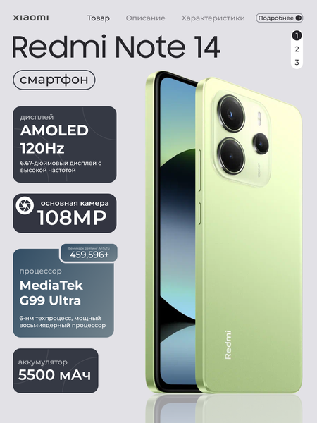 Redmi Note 14 — это мощный и стильный смартфон с отличными характеристиками, который обеспечит вам комфорт в использовании благодаря современным технологиям и элегантному дизайну. Смартфон оснащен 6.67-дюймовым AMOLED экраном с разрешением 2400 x 1080 пикселей и частотой обновления 120 Гц, что делает картинку яркой, четкой и плавной при просмотре видео, играх и повседневной работе. Производительность обеспечивается мощным процессором MediaTek Helio G99 Ultra с 8 ядрами (2x2.20 GHz Cortex-A76 и 6x2.00 GHz Cortex-A55), что позволяет легко справляться с многозадачностью и требовательными приложениями. В сочетании с 6/8 ГБ оперативной памяти и 128/256 ГБ встроенной памяти, телефон гарантирует быстрый доступ к данным и плавную работу даже при многозадачности. Основная камера смартфона — это 108 Мп, которая позволяет делать четкие и детализированные фотографии, а дополнительные 8 Мп широкоугольная камера и 2 Мп макрокамера помогут запечатлеть любой момент с разных ракурсов. Фронтальная камера на 20 Мп с автофокусом и диафрагмой f/2.25 идеально подходит для ярких селфи и видеозвонков. Батарея 5500 мАч обеспечит вам долгую работу без подзарядки, а поддержка быстрой зарядки 33 Вт позволит быстро восстановить заряд. Всё это работает на Android 14 с оболочкой MIUI HyperOS, предоставляя вам доступ к множеству новых возможностей и улучшений. Основные характеристики Redmi Note 14: Дисплей: 6.67", 2400 x 1080, AMOLED, 120 Hz Процессор: MediaTek Helio G99 Ultra (8 ядер, до 2.20 GHz) Оперативная память: 6/8 ГБ Встроенная память: 128/256 ГБ, поддержка MicroSD Основная камера: 108 Мп + 8 Мп + 2 Мп Фронтальная камера: 20 Мп Аккумулятор: 5500 мАч, быстрая зарядка 33 Вт Операционная система: Android 14, MIUI HyperOS Безопасность: Сканер отпечатков пальцев в экране, распознавание лица Цвета: Зеленый, Синий, Черный