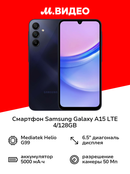 Смартфон Samsung Galaxy A15 LTE Black оснащен большим экраном диагональю 6,5 дюйма разрешением 2340x1080 пикселей, в основе которого матрица лежит Super AMOLED - изображение четкое, с высокой детализацией и реалистичной цветопередачей. Яркость достигает 800 нит, частота обновления 90 Гц обеспечивает плавность прокрутки страниц. Функция Eye Comfort Shield снижает уровень синего свечения и уменьшает усталость глаз при длительном использовании. Восьмиядерный процессор Mediatek Helio G99 частотой 2x2,2 ГГц + 6x2 ГГц и 4 Гб оперативной памяти гарантируют стабильную работу при выполнении повседневных задач. Объем памяти для установки приложений и хранения данных - 128 Гб. Встроен слот для карты microSD, за счет которой хранилище можно расширить (до 1024 Гб). Поддерживается использование двух nano-SIM, слот гибридный. Смартфон работает в стандартах до 4G LTE. Интегрированы модули Wi-Fi, Bluetooth 5.3 и NFC, установлены датчик света, компас, акселерометр, сенсор отпечатка пальца для быстрой авторизации владельца. Основная камера тройная: 50/5/2 Мп. Приблизить объем позволит цифровой зум 10х, получить изображение высокого качества в сложных условиях помогут автофокус, вспышка и цифровая стабилизация. Видео записывается в качестве Full HD (1920x1080 пикселей). Разрешение фронтальной камеры - 13 Мп. Смартфон оснащен аккумулятором емкостью 5000 мА*ч, поддерживающим быструю зарядку. Подключение производится через порт USB Type-C, доступен также 3,5-миллиметровый разъем для наушников. Корпус выполнен из пластика и обладает размерами 160,1х76,8х8,4 мм, вес - 200 г.