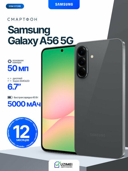 {"widgets":{"@card/DeliveryConsole":{"/content/page/fancyPage/defaultPage/deliveryConsole":{"configType":"MAIN_DO","shouldShowDeliveryPointAgitationBanner":true,"urlSlug":"smartfon-samsung-galaxy-a56-5g-50-mp-super-amoled-120-gts-6128-gb-graphite"}}},"meta":{"/content/page/fancyPage/defaultPage/deliveryConsole":{"name":"@card/DeliveryConsole"}},"collections":{"walterUtils":{"isWalterInitialSuccess":true,"isWalterWithoutFallback":true,"isWalterCanary":false},"deliveryConsole":{"15722933408695151416":{"title":"Доставка Маркета","signals":[],"options":[{"title":"Маркет","type":"MARKET","isChecked":true,"transitionId":"tr_18176047597500668292","subtitle":{"date":{"value":"Сегодня","features":["THINGRAY"]},"price":{"value":0,"valueFeatures":["THINGRAY"],"currency":"UZS","currencyFeatures":["THINGRAY"]}},"details":[{"title":"","deliveryOptions":[{"id":"9652671569143585460","address":{"addressLine":"Ташкент","addressLineObject":{"abbreviativePart":"Ташкент","isRegion":true,"isTagged":false}},"additionalInfo":"","signals":[{"title":{"content":[{"type":"literal","value":"15-30 мин. курьером в удобный момент"},{"type":"icon","value":"ai_chevron"},{"type":"newline","value":""}],"feature":"PRIMARY"},"analytics":{"type":"onClickSignal","text":"15-30 мин. курьером в удобный момент"},"popupInfoId":"pp_18064787403457921207"}]},{"id":"9652671569143585463","address":{"addressLine":"Ташкент","addressLineObject":{"abbreviativePart":"Ташкент","isRegion":true,"isTagged":false}},"additionalInfo":"","signals":[]}],"signals":[]}],"baobabModel":{"deliveryType":"ON_DEMAND","deliveryDays":0,"priceValue":0,"priceCurrency":"UZS","deliveryDateFrom":"2026-02-21","deliveryDateTo":"2026-02-21","deliveryText":"Сегодня, по клику","precise":true,"selected":false,"calculatedFor":"1104c838b83f79c008df7d7a05c6846d;ckbqYOme8D_Vr_CsxnKaOQ"}}]}},"deliveryInfoOption":{"9652671569143585460":{"dayFrom":0,"dayTo":0,"deliveryType":"onDemand","date":{"value":"Сегодня","features":["BOLD"]},"service":{"value":"по клику","features":["THINGRAY"]},"deliveryPrice":{"value":0,"currency":"UZS"},"price":{"value":0,"valueFeatures":["THINGRAY"],"currency":"UZS","currencyFeatures":["THINGRAY"]},"style":"BLUE","baobabModel":{"deliveryType":"ON_DEMAND","deliveryDays":0,"priceValue":0,"priceCurrency":"UZS","deliveryDateFrom":"2026-02-21","deliveryDateTo":"2026-02-21","deliveryText":"Сегодня, по клику","precise":true,"selected":false,"calculatedFor":"1104c838b83f79c008df7d7a05c6846d;ckbqYOme8D_Vr_CsxnKaOQ"},"consoleDate":{"value":"Сегодня","features":["THINGRAY"]}},"9652671569143585463":{"dayFrom":30,"dayTo":30,"deliveryType":"pickup","date":{"value":"23 мар","features":["BOLD"]},"service":{"value":"пункт выдачи","features":["THINGRAY"]},"deliveryPrice":{"value":0,"currency":"UZS"},"price":{"value":0,"valueFeatures":["THINGRAY"],"currency":"UZS","currencyFeatures":["THINGRAY"]},"style":"WHITE","baobabModel":{"deliveryType":"PICKUP","deliveryDays":30,"priceValue":0,"priceCurrency":"UZS","deliveryDateFrom":"2026-03-23","deliveryDateTo":"2026-03-23","deliveryText":"23 мар, пункт выдачи","precise":true,"selected":false,"calculatedFor":"4e2fe580b4414153180565c74f847b4b;ckbqYOme8D_Vr_CsxnKaOQ"},"consoleDate":{"value":"23 мар","features":["THINGRAY"]}}}}}