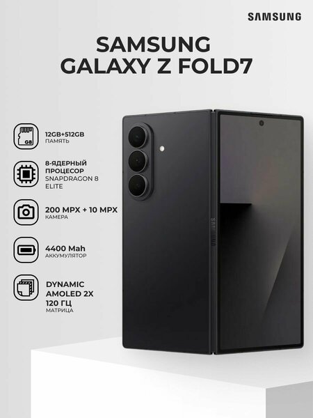 Смартфон Samsung Galaxy Z Fold7 5G 512GB SM-F966BZKCSKZ Jet Black - это уникальное устройство, которое сочетает в себе передовые технологии и стильный дизайн. Этот смартфон от известного бренда Samsung, который зарекомендовал себя на рынке мобильных устройств. Смартфон оснащен мощным процессором Qualcomm Snapdragon 8 Elite с частотой 4470 МГц и 8 ядрами. Это обеспечивает высокую производительность и быстродействие устройства. Смартфон поддерживает стандарты связи 5G, что гарантирует быстрое и стабильное интернет-соединение. Смартфон имеет 12 ГБ оперативной памяти и 512 ГБ встроенной памяти, что позволяет хранить большое количество данных и приложений. Смартфон оснащен тремя основными камерами: широкоугольной, телефото и сверхширокоугольной. Они обеспечивают высокое качество съемки в различных условиях освещения. Смартфон поддерживает быструю и беспроводную зарядку, а также реверсивную зарядку. Это позволяет заряжать устройство без необходимости подключения к источнику питания. Смартфон оснащен цветным экраном Dynamic AMOLED 2X с разрешением 2184x1968 пикселей и диагональю 6,5 дюйма. Частота обновления экрана составляет 120 Гц, что обеспечивает плавное и быстрое отображение информации. Смартфон имеет две nano SIM-карты, что позволяет использовать два номера на одном устройстве. Смартфон имеет степень защиты IP48, что делает его устойчивым к пыли и влаге. В комплекте с смартфоном идут кабель Type-C, скрепка для SIM-карты и документация. Выбирая смартфон Samsung Galaxy Z Fold7 5G 512GB SM-F966BZKCSKZ Jet Black, вы получаете не только стильный и функциональный гаджет, но и уверенность в качестве и надежности бренда Samsung.