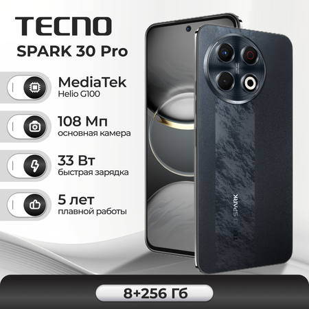 TECNO SPARK 30 Pro Меняйся со SPARK Флагман серии надежных и сбалансированных смартфонов TECNO Spark 30 Pro создан для тех, кому важны продвинутые характеристики по доступной цене. Отличный компаньон для съемки и просмотра контента. Высокая производительность Новый процессор MediaTek Helio G100 обеспечивает отличную производительность. Благодаря новому чипсету, поддерживается связь уровня 4.5G (LTE+, LTE Advanced). Смартфон обладает большим объёмом памяти, что позволяет без труда сохранять все важные приложения, фото, видео и другие данные. Доступны различные варианты размера хранилища данных: ● 256 ГБ + 8 ГБ (+ расширение на 8 ГБ) ● 128 ГБ + 8 ГБ (+ расширение на 8 ГБ) Также есть слот для карты памяти microSD до 1 ТБ. Быстрая зарядка 33 Вт с лёгкостью пополнит энергию смартфона в короткие сроки, также можно выбрать режим скорости зарядки. Новый уровень просмотра контента AMOLED FHD+ экран с частотой обновления 120 Гц обеспечивает практически бесконечную контрастность, глубокий чёрный цвет и плавную картинку. Пиковая яркость дисплея 1700 нит, точная цветопередача и сертификация экрана TÜV Rheinland обеспечивают комфортную работу без вреда для зрения. Благодаря двойным стереодинамикам звук получается в три раза громче и насыщеннее по сравнению с предыдущими моделями. Технология Dolby Atmos и поддержка Hi-Res Audio позволит вам полностью погрузиться в происходящее на экране. Снимайте каждую деталь Снимайте чёткие и неповторимые фото даже ночью c основной камерой 108 Мп и светочувствительным сенсором размером 1/1.52”. Фронтальная камера 13 Мп с двойной вспышкой и возможностью настройки яркости и температуры, поможет запечатлеть каждую вашу эмоцию. Стильный и надёжный дизайн TECNO Spark 30 Pro тоньше всех в новой серии Spark 30, и весит всего 188 грамм. Несмотря на внешнюю элегантность, смартфон можно использовать в различных ситуациях, даже если начался небольшой дождь. На экране есть олеофобное покрытие, поэтому смартфоном можно легко управлять даже мокрыми руками. TECNO Spark 30 Pro доступен в трёх цветах: Чёрный и Белый с пластиковой поверхностью, а также Зелёный с покрытием из экокожи Magic Skin 3.0.