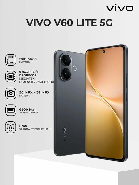 Смартфон Vivo V60 Lite - это современное устройство, которое сочетает в себе передовые технологии и стильный дизайн. Смартфон оснащен 12 ГБ оперативной памяти и 512 ГБ встроенной памяти, что позволяет хранить большое количество данных и приложений. Смартфон имеет 6.77-дюймовый AMOLED-экран с разрешением 2392x1080 пикселей и частотой обновления 120 Гц. Это обеспечивает яркую и четкую картинку, а также плавную анимацию. Аккумулятор емкостью 6500 мАч позволяет долго работать без подзарядки. Смартфон поддерживает быструю зарядку, что позволяет быстро зарядить устройство. Смартфон поддерживает стандарты связи 2G, 3G, 4G LTE и 5G. Это обеспечивает стабильное подключение к интернету и высокую скорость передачи данных. Смартфон оснащен двумя основными камерами с разрешением 50 и 32 МП, а также фронтальной камерой для селфи и видеозвонков. Смартфон имеет пыле- и влагозащиту по стандарту IP65, что делает его надежным и долговечным. Смартфон работает на операционной системе Android 15 и оснащен процессором Dimensity 7360 Turbo от MediaTek. Это обеспечивает высокую производительность и быстродействие устройства. Смартфон Vivo V60 Lite поддерживает функцию разблокировки по лицу и сканеру отпечатка пальца. Это обеспечивает быстрый и удобный доступ к устройству. В комплект поставки входят документация, кабель Type-C–USB, адаптер питания USB, скрепка для извлечения SIM-карты, чехол для телефона и защитная пленка. Смартфон Vivo V60 Lite - это стильный, функциональный и надежный выбор для тех, кто ценит качество и передовые технологии.