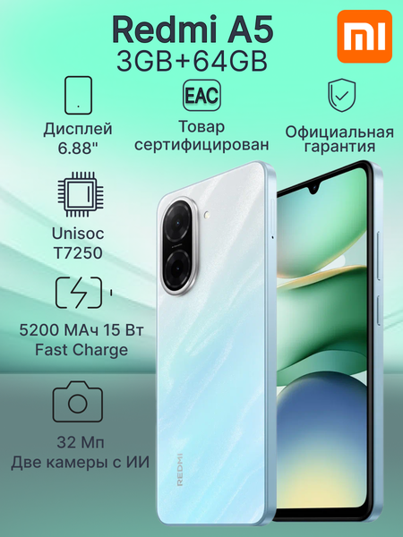 Xiaomi Redmi A5 — удобный и доступный смартфон с современными функциями, который отлично подойдёт для повседневного использования: общения, интернета, фото, видео и простых игр. Устройство оснащено большим экраном диагональю 6.88 дюйма с частотой обновления 120 Гц, что делает прокрутку и анимации особенно плавными. Высокая чувствительность сенсора обеспечивает быструю реакцию на прикосновения — удобно набирать текст, листать ленту или играть. Яркость 450 нит позволяет комфортно использовать смартфон даже при ярком дневном свете. Работает телефон на Android 15 Go — это лёгкая версия операционной системы, оптимизированная для стабильной работы. Внутри установлен 8-ядерный процессор Unisoc T7250 и 3 ГБ оперативной памяти, которые можно виртуально расширить до 6 ГБ. Это даёт быструю работу приложений и плавную многозадачность. Встроенной памяти 64 ГБ хватит для хранения фотографий, видео и приложений. При необходимости можно установить карту памяти до 2 ТБ — хватит на годы вперёд. Основная камера на 32 Мп делает чёткие фото днём и ночью, есть поддержка HDR и ночного режима. Дополнительный сенсор помогает размывать фон на портретных фото. Фронтальная камера на 8 Мп отлично подойдёт для видеозвонков и селфи. Смартфон оснащён аккумулятором ёмкостью 5200 мА*ч, что обеспечивает до 20 часов воспроизведения видео без подзарядки. Зарядное устройство уже в комплекте. Быстрой зарядки нет, но благодаря энергоэффективному процессору смартфон заряжается вполне быстро и держит заряд долго. Redmi A5 поддерживает две SIM-карты, есть слот для карты памяти, стандартный разъём 3.5 мм для наушников, современный разъём USB Type-C и поддержка OTG (можно подключать флешки и другие устройства). Для разблокировки доступны сканер отпечатка сбоку и распознавание лица. Это отличный выбор для тех, кому нужен надёжный и стильный смартфон для общения, соцсетей, музыки, видео и базовых задач — с большим экраном, долгим временем работы и хорошей камерой.