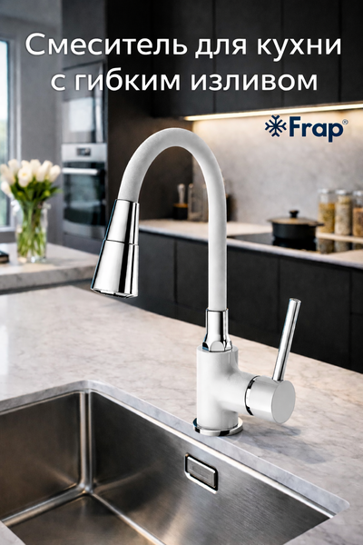 Смеситель для кухонной мойки Frap F4044-8 с гибким изливом, белый хром