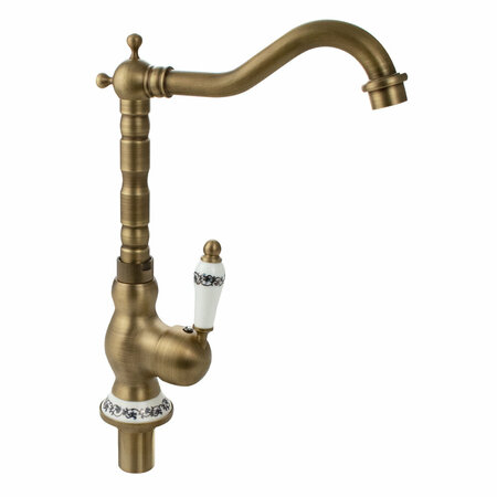 Смеситель для кухонной мойки и раковин, боковой, шаровый, корпус под состаренную бронзу с вставками белой керамики, с высоким Г-образным, поворотным вокруг оси изливом. Материал изготовления — латунь. Крепление резьба - гайка, картридж d = 40 мм, литая ручка. Аэратор для экономии воды. Габаритные размеры: высота 300 мм, длина 230 мм, диаметр посадочного седла 60 мм, длина резьбы 50 мм, длина подводки 400 мм. Вес - 1,250 кг, объём - 0,00680 м3. В комплекте паспорт, корпус с изливом, подводка 1/2, крепеж, набор прокладок.