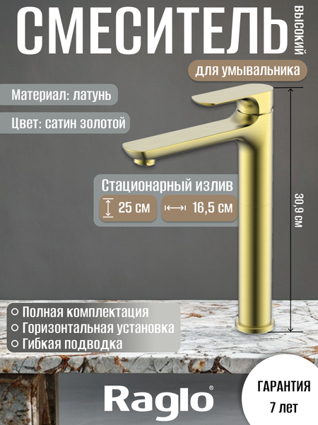 Предлагаем только оригинальную продукцию. Гарантия 7 лет на смеситель от производителя. Элегантный смеситель Raglo для умывальника и раковины, обладающий высоким изливом, станет идеальным решением для вашей ванной комнаты или кухни. Этот кран для раковины высокого типа привнесет в интерьер нотки современности и стиля. Конструкция выполнена из прочной латуни, что обеспечивает надежность и долговечность изделия. Цвет золотой сатин придает блеск и визуально увеличивает пространство, а также легко сочетается с различными дизайнерскими решениями. Керамический картридж диаметром 35 миллиметров гарантирует плавную работу и предотвращает протечки, что делает использование данного устройства максимально комфортным. Гибкая подводка 55см размером 1/2 позволяет легко установить кран для умывальника без лишних усилий. Высокий смеситель отлично подойдет как для раковины на столешнице, так и для традиционных моделей, добавляя функциональности и удобства. Этот смеситель не только стильный элемент сантехники, но и практичное решение для ежедневного использования. Он обеспечивает оптимальный напор воды и удобство в эксплуатации. Каждый раз вы будете наслаждаться высоким уровнем комфорта благодаря продуманной конструкции. Кран для ванной и кухни высокого типа идеально подходит для тех, кто ценит качество и функциональность. Эстетичный вид сочетает в себе простоту форм и современные тенденции дизайна. Выбор данного смесителя станет отличным дополнением к любому интерьеру ванной комнаты и кухни. Простой уход за хромированной поверхностью гарантирует сохранение первоначального внешнего вида на длительное время. Современные технологии обработки материалов обеспечивают устойчивость к коррозии и механическим повреждениям. Приобретая этот смеситель с высоким изливом, вы получаете надежное устройство, которое будет служить вам долгие годы. Это идеальное решение как для новых интерьеров, так и для обновления существующих пространств без необходимости кардинальных изменений.
