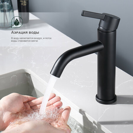 Однорычажный черный смеситель с стационарным изливом и коротким носиком. Низкий излив и округлая форма придают смесителю современный вид. Встроенный аэратор улучшает поток воды, а материал изготовления - латунь - гарантирует прочность и долговечность. Гибкая подводка диаметром 1/2 и система быстрого монтажа отсутствуют. Монтируется на гайке, подводка - гибкая. Экономичный керамический картридж диаметром 35 мм обеспечивает точное регулирование температуры и напора воды. Вам подойдет этот смеситель, если вы ищете модель для одного потребителя. Ограничение температуры отсутствует, что позволяет использовать этот смеситель для разных нужд. Монтаж на одно отверстие, матовое покрытие. Рычаг управления расположен сверху. Высота излива 10,6 см, длина 13,9 см.