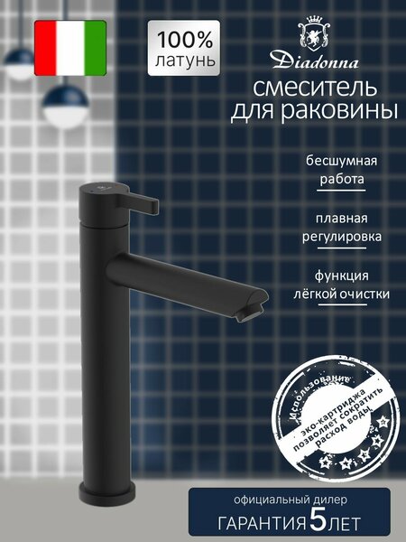 Смеситель Diadonna для раковины из нержавеющей стали с аэратором Смеситель Diadonna из нержавеющей стали предназначен для установки в ванной комнате и сочетает в себе современный дизайн и прочность материала. Изделие выполнено в черном цвете, который легко сочетается с интерьером любой ванной комнаты. Гибкая подводка длиной 40 см (в комплекте 2 штуки) обеспечивает удобство подключения и позволяет легко заменить старый вариант смесителя. Горизонтальный монтаж, однорычажное управление и керамический картридж гарантируют надежность и устойчивость к коррозии. Эргономичная конструкция смесителя способствует экономии воды и легкому управлению напором. Аэратор обеспечивает равномерное распределение воды, а монолитный излив обеспечивает прочность и долговечность. Смеситель Diadonna оснащен функцией экономии воды, что делает его отличным решением для тех, кто ценит функциональность и стиль в своей сантехнике. В комплекте нет душевого гарнитура, но имеется 1 отверстие для монтажа и расположение рычага сверху. Выбирая смеситель Diadonna, вы получаете надежный, долговечный и стильный элемент сантехники, который будет служить вам долгие годы.