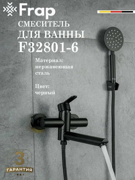 Основные параметры: 1) Цвет: черный 2) Поверхность: матовая 3) Керамический картридж: G52-6 (35mm) 4) Аэратор: G72-1-5 M24- наружная резьба 5) Шланга: G49-1 (1.5 m) 6) 3 режима лейки Смеситель для ванны с душем F32801-6 бренда Frap относится к продукции класса «люкс». Изготовлен из высококачественной нержавеющей стали, что гарантирует его долговечность и надёжность, а также оснащён аэратором, который обеспечивает равномерный поток. Корпус оснащен испанским картриджем Sedal, который плавно открывает воду. Переключение с излива на ручную лейку производится его поворотом. Душевая лейка имеет 3 режима, которые меняются при помощи нажатия кнопки. Кран для ванны с коротким изливом станет стильной изюминкой Вашей ванной комнаты. Производитель даёт гарантию 3 года на корпус смесителя и 1 год на покрытие «черный матовый». Серия F801: Душевая система: F24801-6 Смеситель для раковины: F10801-6 Смеситель для кухни: F43801-6 Смеситель для ванны: F32801-6 Гигиенический душ: F72801-6