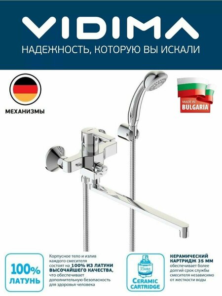 VIDIMA UNO Настенный смеситель для ванны/душа, с керамическим переключателем, монтаж на стандартных эксцентриках (в комплекте: эксцентрики, металлические отражатели, уплотнительные прокладки), трубчатый поворотный излив квадратной формы 320 мм, угол поворота 360˚, аэратор PERLATOR, керамический картридж 35 мм, металлическая рукоятка, индикатор холодной/горячей воды, ручное переключение ванна/душ, душевой гарнитур в комплекте (душевая лейка Ø70 мм, металлический шланг 1500 мм, держатель для лейки)