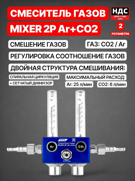 Устройство смешивает углекислоту и аргон в заданных пропорциях. Применяется для сварки тонких металлов (алюминий, титан, нержавеющая сталь, листовая сталь) TIG и MIG сварки в среде защитных газов. Используется совместно с баллонными редукторами. Входные газовые штуцеры оснащены односторонними клапанами, исключающими переток между источниками входного газа, что обеспечивает чистоту готовой смеси. Количество подаваемого газа и его соотношение регулируется вентилями. В смесителе MIXER 2Р (Ar+CO₂) используется двойная структура смешивания: внешняя спиральная циркуляция и внутренний сетчатый диффузор, что позволяет полностью смешивать два газа, поступающих в смеситель, и достигать идеального соотношения концентрации смешанного газа на выходе, что обеспечивает лучший эффект сварки. Для контроля уровня газов в смесителе установлены ротаметры, где максимальные значения для аргона (Ar) – 25,0 л/мин и для углекислого газа (CO₂) – 6,0 л/мин. На задней стенке смесителя встроены два небольших постоянных магнита, для помощи расположения прибора в зоне проведения работ. Комплектация:
