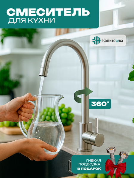 Смеситель для кухни Капитошка с поворотным изливом под гайку, серебристый сатин / код 13102 Надёжный и удобный смеситель для кухни Капитошка — современное решение для раковины и мойки. Этот кухонный кран сочетает функциональность, доступную цену и долговечность. Модель с поворотным изливом 360 градусов обеспечивает свободу движений при работе на кухне и подходит для любых кухонных моек. Корпус изготовлен из нержавеющей стали, устойчивой к коррозии и перепадам температуры. Поверхность с покрытием серебристый сатин выглядит стильно, не тускнеет и легко очищается от загрязнений. Такой смеситель из нержавейки гармонично вписывается в интерьеры любого стиля — от минимализма до классики. Поворотный излив позволяет удобно набирать воду, мыть крупную посуду и ополаскивать раковину. На конце установлен аэратор, который формирует мягкий поток, снижает разбрызгивание и обеспечивает экономию воды до 30 %. Поток становится ровным, объёмным и тихим — комфорт без компромиссов. Керамический картридж внутри смесителя гарантирует плавный ход рычага и точную регулировку температуры. Это надёжный механизм, рассчитанный на долгие годы службы. Монтаж под гайку прост и не требует специальных инструментов. Стандартное отверстие 35 мм и гибкая подводка 35 см в комплекте делают установку максимально быстрой. Технические характеристики: • Тип — смеситель для кухни, кран для мойки • Материал — нержавеющая сталь AISI 304 • Покрытие — серебристый сатин / матовый хром • Излив — поворотный 360 ° круглый • Механизм — керамический картридж • Крепление — под гайку • Рабочее давление — 0,5–10 Бар • Макс. температура — до 90 °C • Гарантия — 1 год на корпус Смесители «Капитошка» — российская торговая марка сантехнических изделий, производимых на современных заводах в России и Китае. Каждый смеситель Капитошка соответствует международным стандартам качества, сочетая традиционный и современный дизайн, надёжные материалы и разумную цену. Это оптимальный выбор для тех, кто ищет кухонный смеситель эконом-класса с поворотным изливом, аэратором, керамическим картриджем и надёжным креплением под гайку.