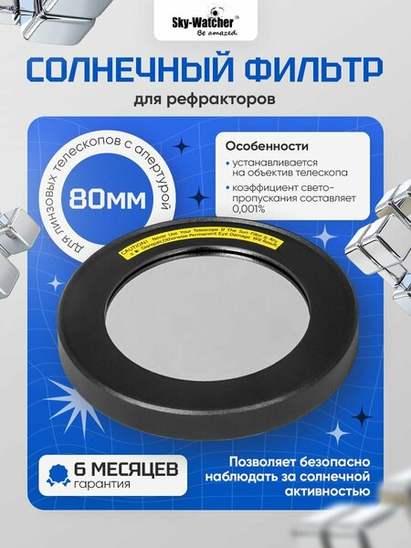 Солнечный фильтр Sky-Watcher для рефракторов 80 мм – аксессуар для безопасного наблюдения Солнца. Установив его на объектив телескопа, вы сможете изучать солнечную активность без опасений за зрение. Фильтр отсекает вредное излучение, пропуская лишь 0,001% видимого света. Цвет Солнца при этом остается нейтрально-белым. Солнечный фильтр Sky-Watcher сделан из солнцезащитной астрономической пленки и предназначен для использования с рефракторами с апертурой 80 мм. С помощью фильтра через телескоп можно рассматривать структуру солнечных пятен, грануляцию и факельные поля. Внимание! Никогда не смотрите на Солнце без специального фильтра. Это может необратимо повредить зрение и привести к слепоте.