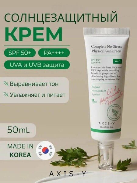 AXIS-Y Полный физический солнцезащитный крем без стресса, 50мл AXIS - Y's Complete No-Stress Physical Sunscreen теперь представлен в обновленной формуле со скваланом и гиалуроновой кислотой, которые увлажняют кожу и обеспечивают защиту от солнца SPF50+ PA++++. Усиленный экстрактами полыни, календулы и ромашки, этот натуральный солнцезащитный крем борется со свободными радикалами, не раздражая кожу. Крем-формула с 2% ниацинамидом придает коже сияние. Особенности Преимущества: