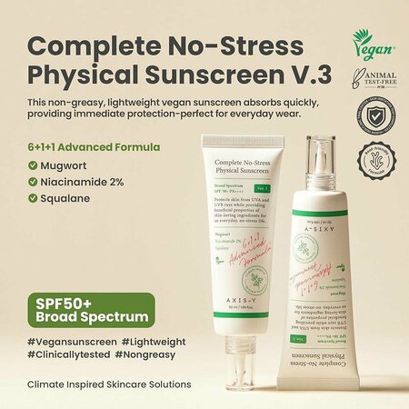 Солнцезащитный крем AXIS-Y Complete No-Stress Physical Sunscreen V.3 SPF50+ - это высококачественный продукт, который обеспечивает надежную защиту от ультрафиолетовых лучей и предотвращает появление нежелательного загара. AXIS-Y Complete No-Stress Physical Sunscreen V.3 SPF50+ обеспечивает высокую степень защиты от солнца. Благодаря этому, вы можете наслаждаться пребыванием на солнце без страха получить солнечный ожог или повредить кожу. Солнцезащитный крем AXIS-Y Complete No-Stress Physical Sunscreen V.3 SPF50+ также помогает предотвратить преждевременное старение кожи и образование морщин. Продукт легко наносится и быстро впитывается, не оставляя ощущения липкости или жирности на коже. AXIS-Y Complete No-Stress Physical Sunscreen V.3 SPF50+ подходит для всех типов кожи, включая чувствительную и склонную к аллергии. Солнцезащитный крем AXIS-Y Complete No-Stress Physical Sunscreen V.3 SPF50+ - это надежный выбор для тех, кто заботится о своей коже и хочет защитить ее от вредного воздействия солнечных лучей.