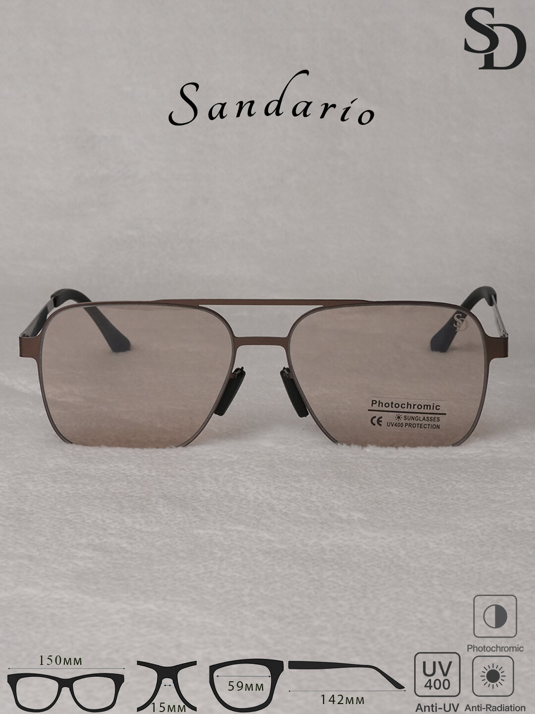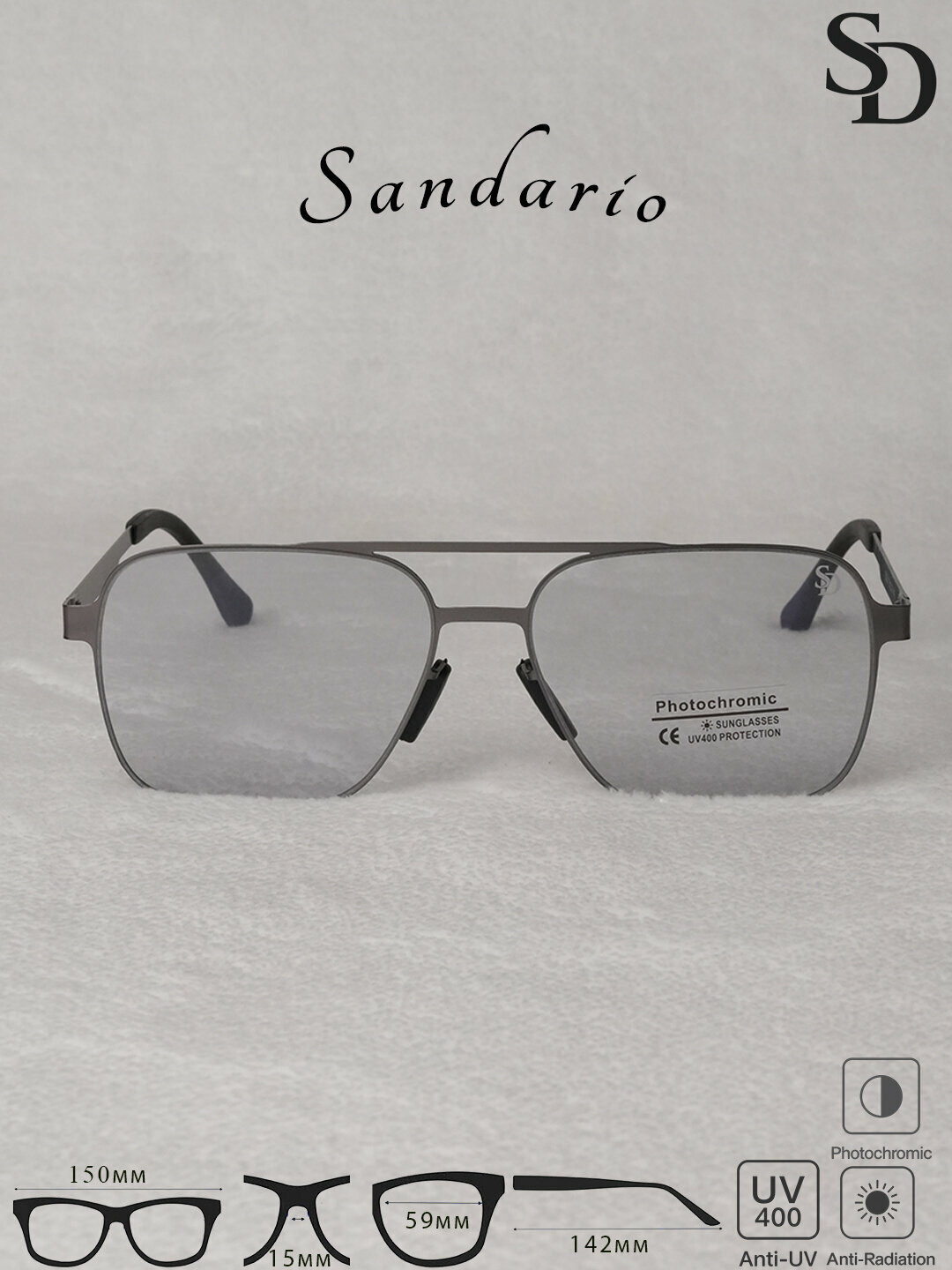 Солнце защитные очки SANDARIO — стильный аксессуар с металлической оправой, созданный для комфортного ежедневного ношения. Модель оснащена Anti-Radiation защитой и UV400, а также фотохромным эффектом и обеспечивают удобную посадку и надёжную фиксацию на лице.