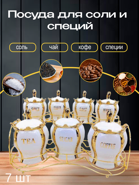 Набор керамических баночек для соли и специй – 7 шт. ✨ Элегантный дизайн и практичность в каждой детали! Малые баночки (4 шт.) – вместимость до 320 г Большие баночки (3 шт.) – вместимость до 1 кг Всего: 7 шт. Материал: керамика, отполированная Производство: Китай Надписи: SPICE, FLOUR, SALT, PEPPER, TEA, SUGAR, COFFEE Металлическая подставка в комплекте – баночки смотрятся аккуратно и стильно Добавит вашей кухне порядок и утончённость Идеальный вариант для подарка – современный дизайн и практичность порадуют ваших близких!