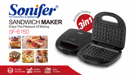 Sonifer SF-6150 — это универсальный кухонный прибор «3-в-1», предназначенный для приготовления горячих сэндвичей, вафель и блюд на гриле. В комплект входят три сменные панели, которые позволяют легко менять режим приготовления. Антипригарное покрытие предотвращает пригорание пищи и облегчает уход за устройством. Компактный и современный дизайн делает прибор удобным для использования дома. Основные характеристики: Функции 3-в-1: сэндвичница, гриль, вафельница Сменные панели Антипригарное покрытие Мощность: около 800 Вт Быстрый нагрев Простота и удобство в использовании