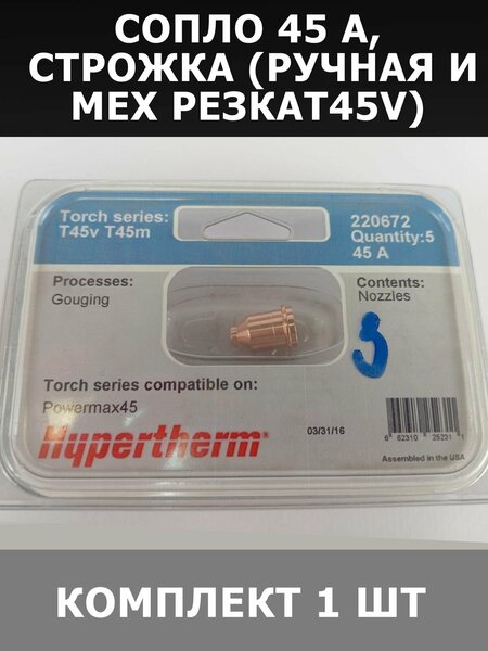 Сопло 45 А для строжки и ручной резки от Hypertherm - это высококачественный аксессуар, который обеспечивает стабильную и эффективную работу при выполнении строжки и ручной резки. Сопло 45 А от Hypertherm разработано специально для использования с ручными и механическими резаками T45v. Оно обеспечивает стабильное и точное формирование струи газа, что позволяет достичь максимальной эффективности при выполнении строжки и ручной резки. Благодаря использованию сопла 45 А от Hypertherm, вы сможете улучшить качество своих работ, сократить время на выполнение задач и повысить производительность. Выбирая сопло 45 А от Hypertherm, вы получаете надежный и качественный аксессуар, который поможет вам достичь максимальных результатов при выполнении строжки и ручной резки.