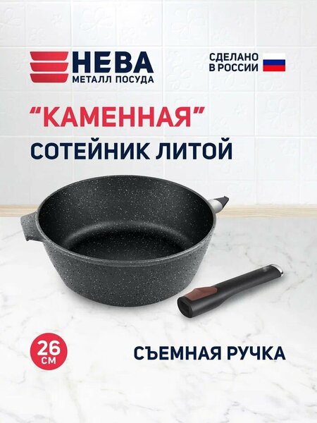 Литой сотейник черный гранит 26 см со съемной ручкой от компании Нева металл посуда- первого производителя литой антипригарной посуды в России для всех типов плит. НМП 26 лет выпускает антипригарную посуду, более 500 позиций ассортимента. Усиленное антипригарное покрытием подойдет для ежедневного приготовления разнообразных блюд для всей семьи, особенно для тушения, пассеровки, припускания и томления. В нем варят и жарят. Высота бортов сотейника -10см(в сковородках 5-7см). Подходит для плит: газовых, электрических, стеклокерамических. Для дома и дачи. Толщина стенок 3,5мм, дна 4мм обеспечивает равномерный нагрев. Сотейник изготовлен из литого алюминия с прочным и долговечным антипригарным покрытием, которое позволяет готовить без добавления масла или с минимальным его количеством. Высококачественное и многослойное противопригорающее покрытие не содержит пфоа и безопасно для здоровья даже в случае повреждения. Можно готовить в духовке, не забудьте снять ручку. Легко моется вручную, можно мыть в посудомоечной машине или просто протереть бумажным полотенцем. Такое же покрытие есть на наших сковородках, кастрюлях, казанах, жаровнях, сковородах-гриль и вок. Другие наши изделия можно приобрести в разных цветах (розовый, золотой, синий, бежевый, фисташковый). Согласно ГОСТ протачиваем дно, чтобы гладкое дно не царапало плиту. Рекомендуем использовать деревянные, силиконовые или пластиковые аксессуары. Для мытья выбирайте средства с нейтральным pH (6-8). Избегайте перегрева выше 200 °C(покрытие не любит перегрева). Корпус сотейника не деформируется при любой температуре. Гарантия 2 года. Следите чтобы ручка сотейника не выступала за край плиты или стола, что обеспечит безопасность для семьи и детей. Уверенность в качестве своей продукции мы выражаем через честную гарантию. Политика компании: замена всех изделий, вызвавших обоснованные нарекания покупателя, в течение гарантийного срока.
