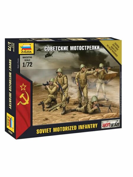 Возраст 7+ Масштаб 1:72 Детали х 26 Размер, см 2.4 Сборные солдатики - Советские мотострелки. Набор открывает новую, востребованную тему – современные армии. Используя накопленный опыт в производстве миниатюр, самые современные технологии, исторических консультантов, мы создали лучшие миниатюры на рынке. Уникальность данных наборов в том, что все они собираются без помощи клея! В наборе пять реалистичных фигур с разнообразным вооружением. Все миниатюры этой серии, могут быть использованы в новой игровой системе “Hot War”. Историческая справка: Советская мотопехота – это потомки славных полков и дивизий, сражавшихся на полях Великой Отечественной Войны. Они отлично обучены и хорошо обмундированы. Советская армия вплоть до развала Советского Союза являлась самой сильной в мире. Грозная техника, выучка и смекалка солдат, опыт командования – всё это делало советскую армию отличным в аргументах любых спорах на высших политических аренах. Использование мотострелков в HotWar: Пехота на поле боя является основой любой армии, именно они отлично справляются с преодолением той местности, куда техника, зачастую, войти не может. Пехотные характеристики в селениях, сводят на нет преимущество грозных боевых машин в борьбе против них. Набор деталей для сборки 5-ти неокрашенных фигур. Состав набора: 5 неокрашенных солдатиков отрядная подставка с флагом