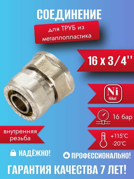 Простой монтаж: Компрессионное соединение для трубы 16 мм и внутренняя резьба 3/4" для быстрого подключения к арматуре.