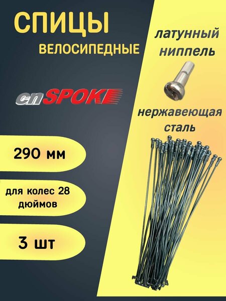 Набор спиц серебристого цвета 3 шт. производства тайваньской компании CNSPOKE. Изделие из нержавеющей стали диаметром 2 мм обладает высокими показателями жесткости и прочности. Длинна спиц 290 мм. Поставляется в комплекте с латунным ниппелем.