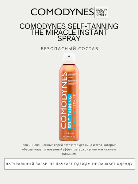 Автозагар моментальное чудо COMODYNES MIRACLE INSTANT TANNING SPRAY 200 ml Спрей-автозагар с мгновенным увлажняющим и антиоксидантным эффектом Вы ищете естественный загар с эффектом макияжа? Self-Tanning The Miracle Instant — это спрей-автозагар, который придаст вам идеальный вид без пятен, просто нанеся его. Карамельные пигменты для макияжа придадут вам мгновенный и естественный «праздничный» тон. Легко наносится, не оставляет пятен. С восхитительным летним ароматом. Идеально подходит для лица и тела. Обогащен питательными растительными ингредиентами. Мгновенный загар после первого применения. Спрей 200 мл.