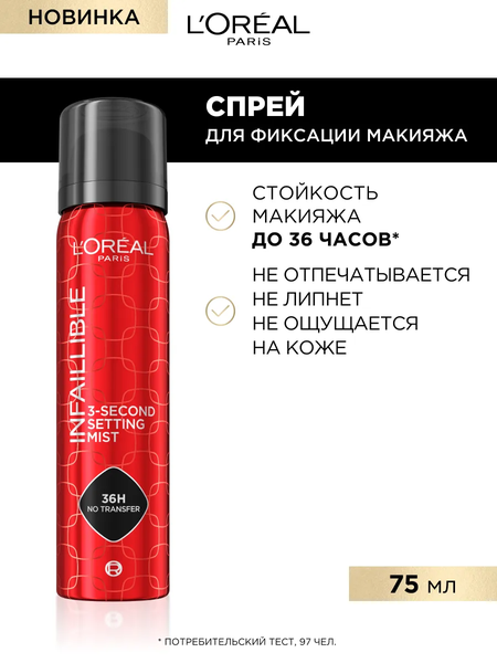 Увлажняющая формула без ощущения стянутости Удобный распылитель для равномерного нанесения Идеален для ежедневного использования и особых случаев Дерматологически протестировано Надёжная фиксация макияжа до 24 часов Защищает макияж от смазывания и осыпания Лёгкая, невесомая текстура Матирует кожу и контролирует жирный блеск Подходит для всех типов кожи Быстро впитывается, не оставляя липкости Первый фиксирующий спрей, который делает ваш макияж стойким за 3 секунды. Фиксирует и сохраняет стойкость макияжа до 36 часов. Не отпечатывается, не липнет и не ощущается на коже благодаря микро-распылению. Распылить поверх макияжа на расстоянии 15-20 см от лица. Подождать 3 секунды для полного высыхания. Фиксирует и сохраняет стойкость макияжа до 36 часов. Не отпечатывается, не липнет, не ощущается на коже. фиксация; стойкость макияжа; водостойкий Спрей для фиксации макияжа L'Oréal Paris Infaillible 3-Second Setting Mist — это идеальное решение для тех, кто хочет сохранить свежий и стойкий макияж в течение всего дня. Формула с лёгкой текстурой равномерно наносится и моментально фиксирует макияж, не создавая ощущения липкости или сухости. Благодаря технологии No Transfer, средство предотвращает смазывание макияжа и отпечатывание на одежде или телефоне. Обеспечивает до 36 часов стойкости, подходит для всех типов кожи и не закупоривает поры. Закончите нанесение макияжа (тон, пудра, румяна и т. д.). Хорошо встряхните флакон перед использованием. Держите спрей на расстоянии 20–25 см от лица. Закройте глаза и распылите средство 2–4 раза, равномерно по всей поверхности лица. Дайте высохнуть естественным способом. Не вытирать и не растирать. Используйте по мере необходимости для обновления стойкости макияжа в течение дня. Спрей для фиксации макияжа L’Oreal Paris фиксирующий спрей для лица матирующий фиксатор макияжа увлажняющий фиксатор макияжа стойкий макияж на весь день спрей для закрепления косметики защита макияжа от влаги и жары финишный спрей для макияжа легкая текстура спрея для лица уход и фиксация макияжа в одном