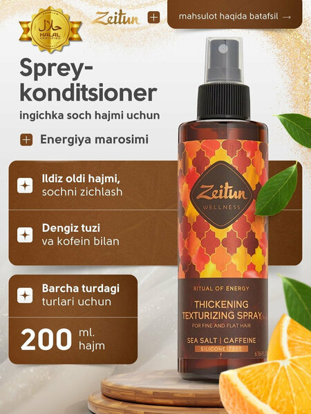Спрей-кондиционер Zeitun «Ритуал энергии» придает объем и плотность тонким волосам. Формула 2-в-1 с морской солью и кофеином обеспечивает прикорневой объем, текстуру и укрепление волос по всей длине.