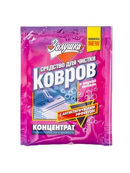 Описание: Высококонцентрированное водорастворимое пенное средство для ручной глубокой чистки и антистатической обработки ковров, ковровых покрытий, обивки мягкой мебели, салонов автомобилей и других текстильных покрытий. Удаляет загрязнения, освежает, дезодорирует, возвращает яркость красок и снимает электростатический заряд, препятствуя накоплению пыли. Одной упаковки достаточно для чистки двух ковров размером 3х4 м. Способ применения: Перед применением проведите сухую уборку пылесосом и протестируйте стойкость окраски ковра к воздействию средства на малозаметном участке. Растворите содержимое пакета в 5 л воды. Взбейте с помощью губки плотную пену, нанесите ее на ковер и почистите щеткой или губкой, стараясь сильно не увлажнять поверхность. После высыхания обработайте ковер пылесосом. Меры предосторожности: Хранить в плотно закрытой таре, в недоступном для детей месте, вдали от пищевых продуктов. При попадании в глаза - промыть большим количеством воды.