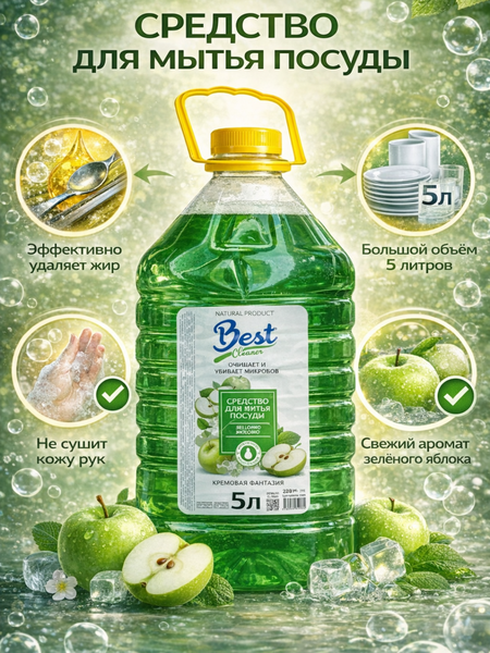 Средство для мытья посуды Best Cleaner с ароматом яблоко — это экономичный и эффективный помощник на кухне. Быстро удаляет жир и неприятные запахи, уничтожает микробы, образует густую пену и легко смывается, не оставляя следов. Приятный яблоко аромат придает посуде свежесть. Основные преимущества ✅ Лимонная формула — эффективно удаляет жир и запахи. ✅ Очищает и убивает микробы. ✅ Густая пена — экономичный расход. ✅ Полностью смывается, не оставляет следов. ✅ Большой объем 5 л — надолго хватает. Характеристики Бренд: Best Cleaner Тип продукта: Средство для мытья посуды Объем: 5 литров Аромат: яблоко Применение: Для ручного мытья посуды Срок годности: 24 месяца Стандарт: GOST 32786-2014 средство для мытья посуды, яблоко средство для посуды, Best Cleaner, жидкость для мытья посуды 5 л, средство против жира, посудомоечное средство, недорогое средство для посуды, пенящееся средство для мытья, антисептическое средство для посуды
