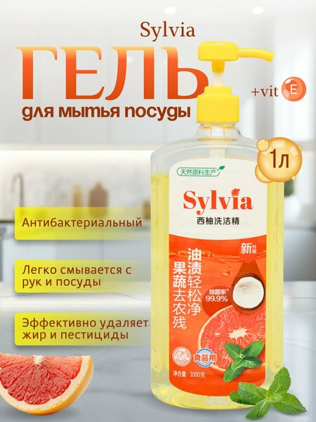 Средство для мытья посуды Sylvia 1L, с удобной помпой, для посуды, фруктов и овощей