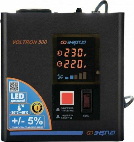 Стабилизатор Энергия VOLTRON - 500 Е0101-0153 относится к оборудованию релейного типа, который используется для защиты от скачков напряжения различных бытовых приборов - котлов, компьютеров, телевизоров и пр. Устройство корректирует вольтаж с погрешностью до 5%. Отличается простотой эксплуатации, надёжностью и долговечностью, а также устойчивостью к низким и высоким температурам. Задержка включения - 180 секунд / 6 секунд. Время реакции на изменение напряжения - 10 мс. Защита от перегрузки по току - автоматический выключатель. Особенности Энергия VOLTRON - 500 Е0101-0153 Лёгкий контроль за показателями Цветной современный LED-дисплей информирует пользователя об основных показателях работы. Преимущества Энергия VOLTRON - 500 Е0101-0153: Стабилизатор Энергия VOLTRON - 500 Е0101-0153 работает даже при очень низких и высоких входных напряжениях - 95-280 вольт Высокая точность стабилизации. Погрешность, с которой данный аппарат корректирует вольтаж, не превышает ±5% Полная мощность 500 ВА позволяет подключать нагрузку величиной до 350 ватт. Этот аппарат подходит для защиты маломощных бытовых потребителей (например, компьютера, телевизора или газового котла) Морозостойкость. Этот стабилизатор можно использовать даже в очень холодном помещении при температурах от -30 до +40 градусов Мобильность, универсальный монтаж Быстрое подключение и простота в обращении с освоением этого прибора не будет проблем даже у новичков. Сзади аппарата имеется сетевой кабель с вилкой для подключения к сети, а сверху стабилизатора находится розетка для присоединения потребителя. У этой модели всего два органа управления: главный выключатель и кнопка выбора продолжительности задержки включения Изменяемая задержка подачи питания (6 или 180 секунд). После включения стабилизатор выдерживает паузу продолжительностью 6 или 180 секунд (на дисплее ведется обратный отсчет), по истечении которой потребителям подается питание. 6-секундная пауза нужна стабилизатору для анализа сети, такую задержку используют по умолчанию Задержка 180 секунд используется для защиты потребителей с электродвигателем от частых пусков, крайне нежелательных для такого оборудования. Установив задержку 180 секунд, вы обеспечите безопасные для устройства с электромотором интервалы между включениями, и частые перебои в питании ему будут не страшны