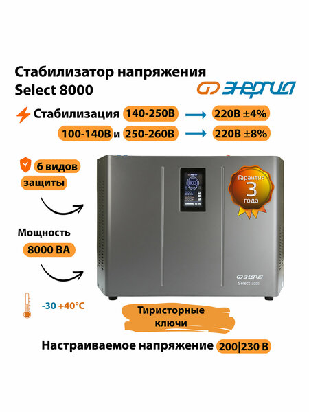 Стабилизатор напряжения Энергия Select 8000 – мощность под контролем Надежный тиристорный стабилизатор, созданный для людей, которые ценят стабильность и мощность в каждой детали. Это устройство обеспечивает безупречную защиту техники от перепадов напряжения, гарантируя точную и надежную работу даже в сложных условиях. Основные характеристики: