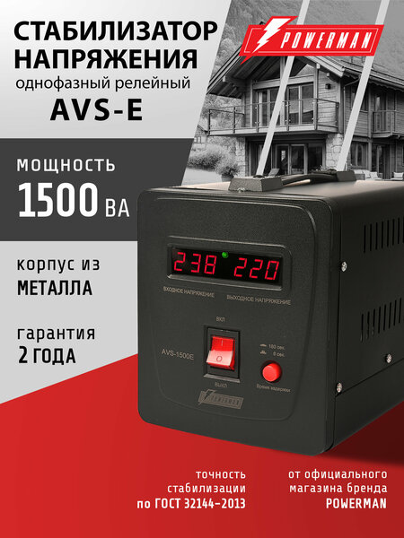 Стабилизатор напряжения POWERMAN AVS-E на защите вашей техники: 1. Быстрая стабилизация – 5–7 мс позволяет эффективно защищать подключенное оборудование от скачков напряжения. (из инфо ниже) 2. Выходной сигнал соответствует стандартам ISO 9001 · Цифровая индикация отображает текущие параметры работы, упрощая контроль и диагностику. · Широкий диапазон входного напряжения: от 130 до 260 В, что обеспечивает стабильную работу при нестабильном электроснабжении. 3. Многоуровневая защита: от перенапряжения, пониженного напряжения, перегрева и перегрузки (из инфо ниже) 4. Компактный корпус размеры настольного/напольного типа со степенью защиты IP20 в современном дизайне в белом или черном цвете впишется в стиль любого рабочего и жизненного пространства. 5. Разнообразие вариантов по мощности подключаемой нагрузки: позволяет подобрать стабилизатор в зависимости от потребляемой мощности и требований к подключению. AVS – E — это универсальные релейные стабилизаторы для дома, дачи или офиса: AVS 1500E (1500 ВА / ~1050 Вт) Подходит для: