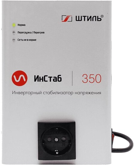 Однофазный инверторный стабилизатор напряжения Штиль ИнСтаб IS350 мощностью 350 ВА / 300 Вт защищает от нестабильного напряжения в сети: отопительное, нагревательное и насосное оборудование; компьютеры и оргтехнику; телевизоры, видео- и аудиоаппаратуру; осветительные приборы; холодильное оборудование; охранную сигнализацию и электроинструменты. Это электроприбор нового поколения с улучшенными возможностями стабилизации напряжения. В основу его работы заложен принцип двойного преобразования электроэнергии, благодаря чему модель: обеспечивает бесступенчатую и непрерывную стабилизацию входного напряжения в широком диапазоне (90-310 В); формирует на выходе напряжение с идеальным синусом и повышенной точностью (± 2%); питает нагрузку бесперебойно в течение 200 мс в случае кратковременного отключения электроэнергии. Стабилизатор разработан и производится в России, он отлично адаптирован под специфику работы электроприборов в российских электросетях. Качество его работы подтверждено сертификатом соответствия Таможенного союза (EAC). На модель распространяется двухлетняя гарантия производителя. Работает полностью бесшумно благодаря конвенционной (безвентиляторной) системе охлаждения и отсутствию механических элементов.