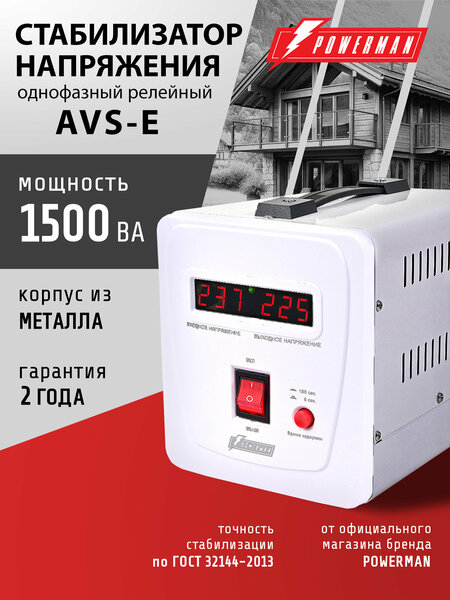 Стабилизатор напряжения POWERMAN AVS-E на защите вашей техники: 1. Быстрая стабилизация – 5–7 мс позволяет эффективно защищать подключенное оборудование от скачков напряжения. (из инфо ниже) 2. Выходной сигнал соответствует стандартам ISO 9001 · Цифровая индикация отображает текущие параметры работы, упрощая контроль и диагностику. · Широкий диапазон входного напряжения: от 130 до 260 В, что обеспечивает стабильную работу при нестабильном электроснабжении. 3. Многоуровневая защита: от перенапряжения, пониженного напряжения, перегрева и перегрузки (из инфо ниже) 4. Компактный корпус размеры настольного/напольного типа со степенью защиты IP20 в современном дизайне в белом или черном цвете впишется в стиль любого рабочего и жизненного пространства. 5. Разнообразие вариантов по мощности подключаемой нагрузки: позволяет подобрать стабилизатор в зависимости от потребляемой мощности и требований к подключению. AVS – E — это универсальные релейные стабилизаторы для дома, дачи или офиса: AVS 1500E (1500 ВА / ~1050 Вт) Подходит для: