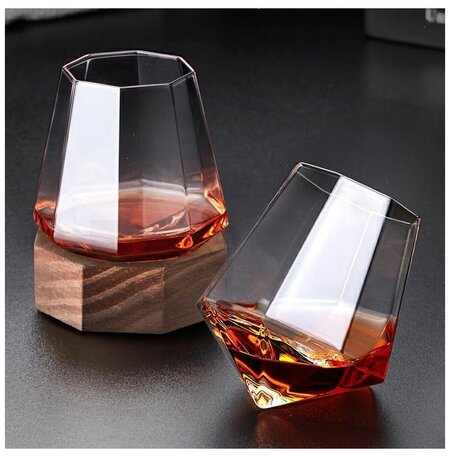 Многогранный стакан на деревянной подставке для виски в форме драгоценного алмаза станет идеальным подарком настоящему ценителю эстетики крепких напитков. Его уникальная форма позволяет ставить бокал на одну из граней, не боясь расплескать напиток. Перекатывая стакан для виски в руке или по поверхности, вы сможете в полной мере насладиться игрой напитка, раскрывая полностью его аромат и вкус. Благодаря точно рассчитанной ширине, бокал для виски можно ставить на любую из граней, он устойчив и не требует дополнительной опоры. Изготовленный из прочного прозрачного стекла, бокал для виски алмаз идеально подходит для крепких алкогольных напитков, а также безалкогольных соков или коктейлей. Этот стильный стакан для виски в форме многогранного бриллианта станет отличным подарком ценителю крепких напитков или стильным аксессуаром в домашнем баре. Объем составляет 350 мл. Если вы ищете подарок ценителю скотча, виски, коньяка или другого элитного алкоголя, бокал для напитков Diamond станет настоящей находкой. Выполнен этот стильный бокал в виде бриллианта с восемью гранями, при этом для его фиксации на горизонтальной поверхности следует поставить стакан под углом на одну из граней. Также в комплект входит подставка из натурального дерева.